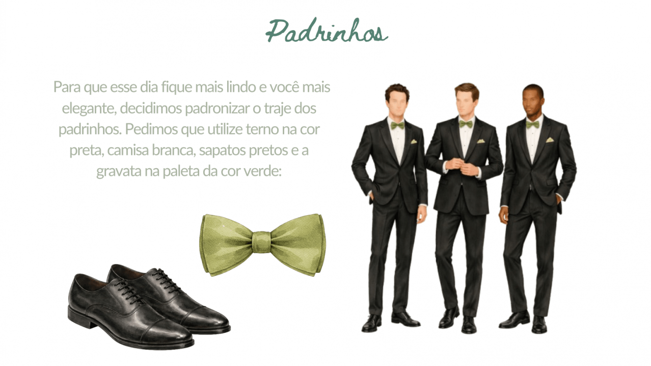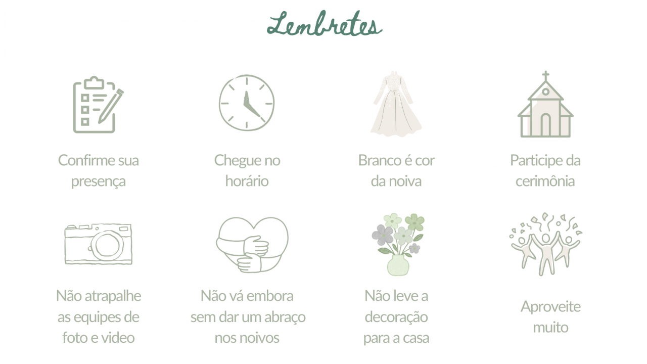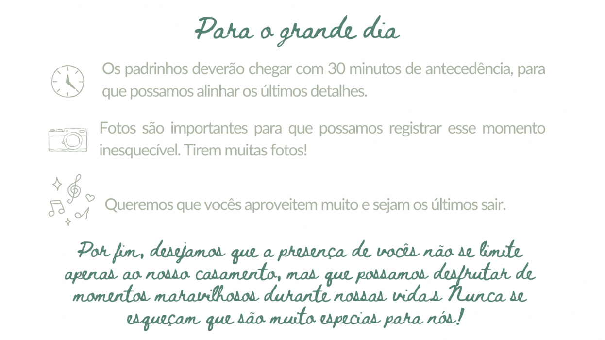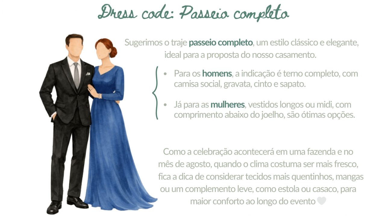 Pensamos em cada detalhe para que todos se sintam confortáveis e para que o clima do casamento esteja em harmonia com o local, o horário e a proposta da celebração. Abaixo, reunimos algumas informações que podem ajudar vocês a aproveitarem esse momento conosco da melhor forma possível 🤍